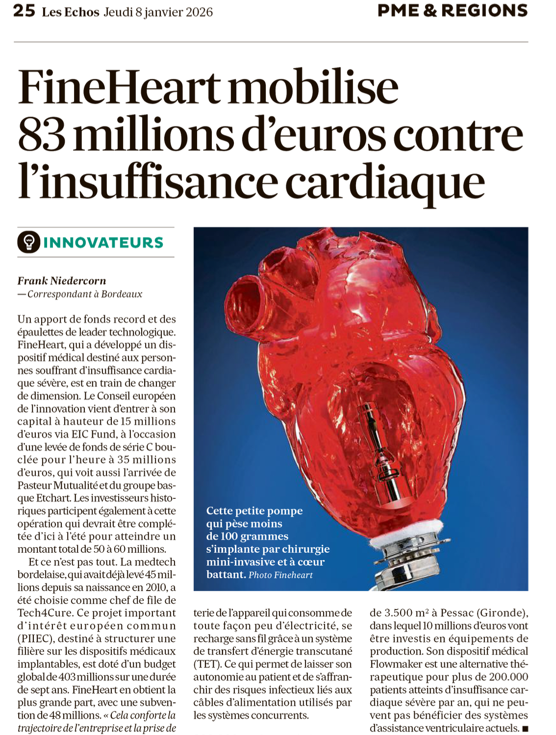FineHeart S.A, est une start-up innovante dans le domaine cardiaque, située à Pessac, en métropole bordelaise. Elle développe principalement l’ICOMS (Intra Cardiac Output Management System), une pompe intracardiaque innovante, permettant à des patients souffrant d’insuffisance cardiaque sévère, de gagner en espérance de vie et de retrouver un confort de vie. Fondée par des médecins et ingénieurs, c’est une technologie alliant mécanique, électronique et informatique au service de la clinique afin de proposer une alternative complètement nouvelle aux assistances cardiaques classiques par une approche plus physiologique et donc plus adaptée au patient. http://fineheart.fr/the-technologie/