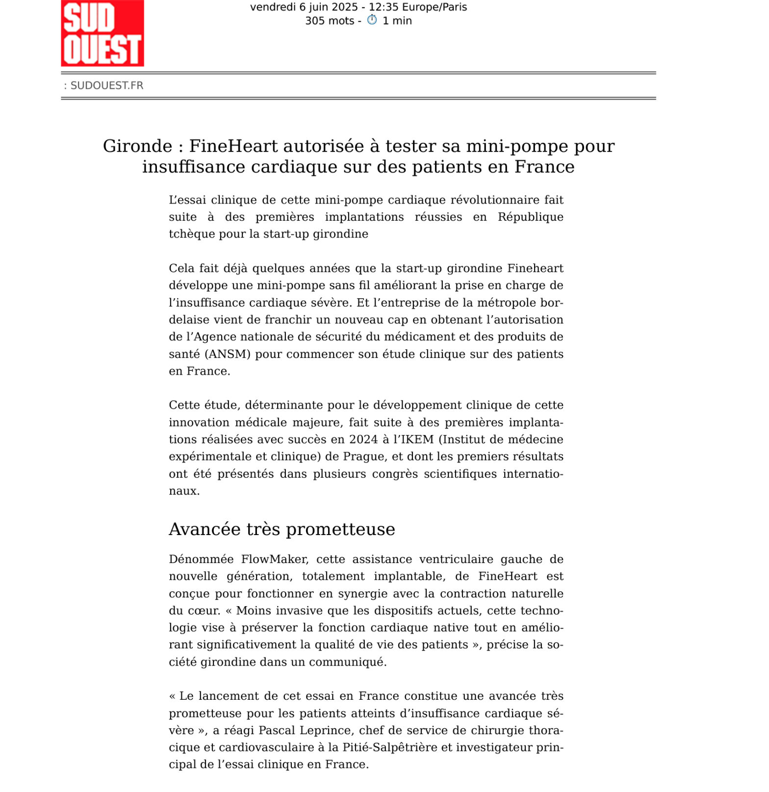 FineHeart S.A, start-up innovante dans le domaine cardiaque, est située à Pessac, en métropole Bordelaise. Son nouveau dispositif médical, l’ICOMS Flowmaker® (Intra Cardiac Output Management System), est une pompe intracardiaque, permettant à des patients souffrant d’insuffisance cardiaque sévère, de les aider à compléter leur fraction d’éjection native par cycle cardiaque. Ce dispositif combine l’expertise de deux célèbres cardiologiques et le savoir-faire de talentueux ingénieurs dans les domaines mécaniques, électroniques et automatiques.