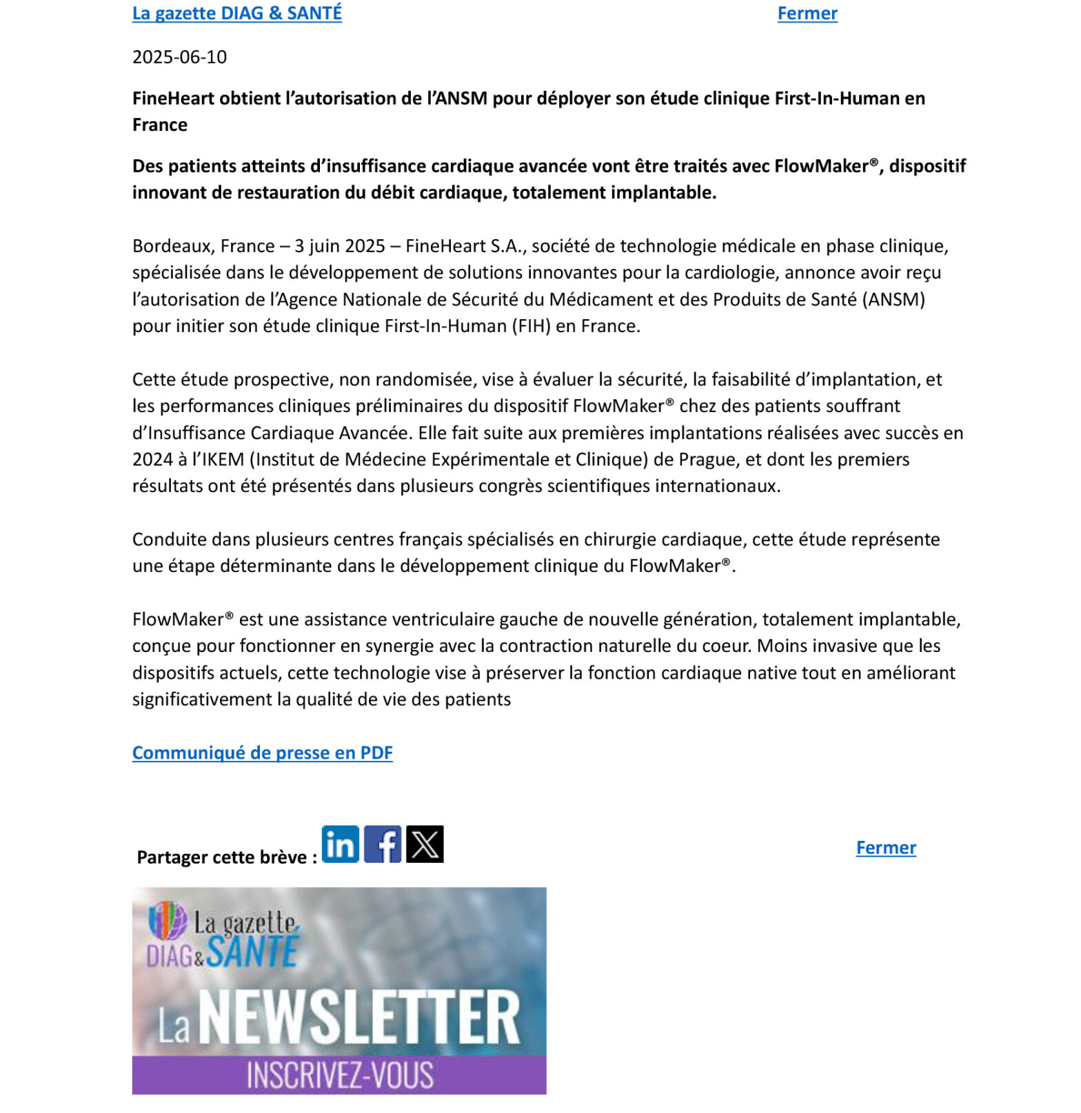 FineHeart S.A, start-up innovante dans le domaine cardiaque, est située à Pessac, en métropole Bordelaise. Son nouveau dispositif médical, l’ICOMS (Intra Cardiac Output Management System), est une pompe intracardiaque, permettant à des patients souffrant d’insuffisance cardiaque sévère, de les aider à compléter leur fraction d’éjection native par cycle cardiaque. Ce dispositif combine l’expertise de deux célèbres cardiologues et le savoir-faire de talentueux ingénieurs dans les domaines mécaniques, électroniques et des automatismes.